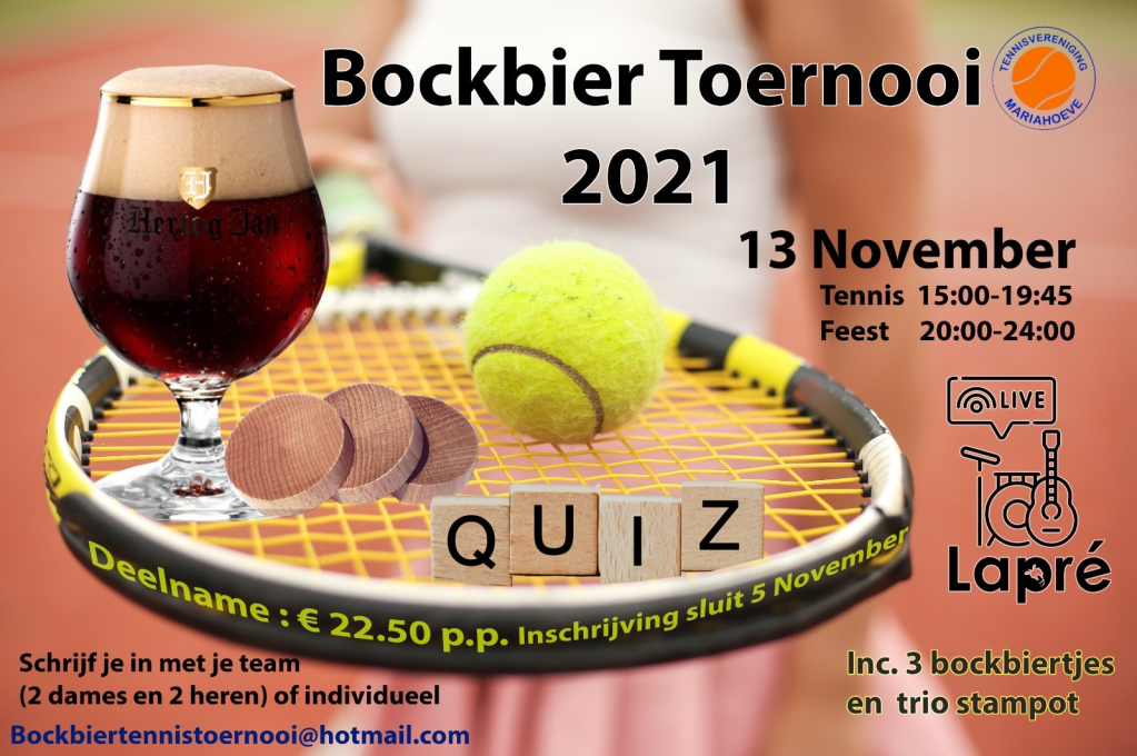 Ons Bockbiertoernooi beleeft dit jaar zijn 6e editie! Voor EUR 22,50 heb je tennis, gezelligheid, 3 bockbiertjes (of wijntjes of alcoholvrije drankjes), een stamppot-maaltijd én een optreden van de Lapré Band. Het is een populaire activiteit, dus schrijf je snel in via bockbiertennistoernooi@hotmail.com.