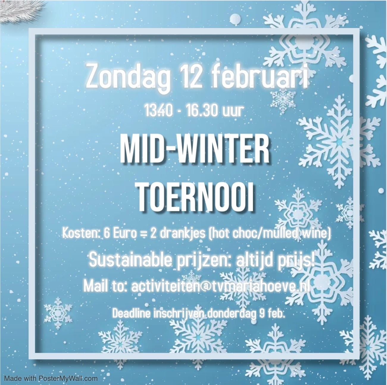 Wat een pech dat het Midwintertoernooi begin februari niet door kon gaan vanwege het slechte weer. Maar: we laten ons niet kisten en gaan er gewoon nog een keer voor op zondag 27 februari!